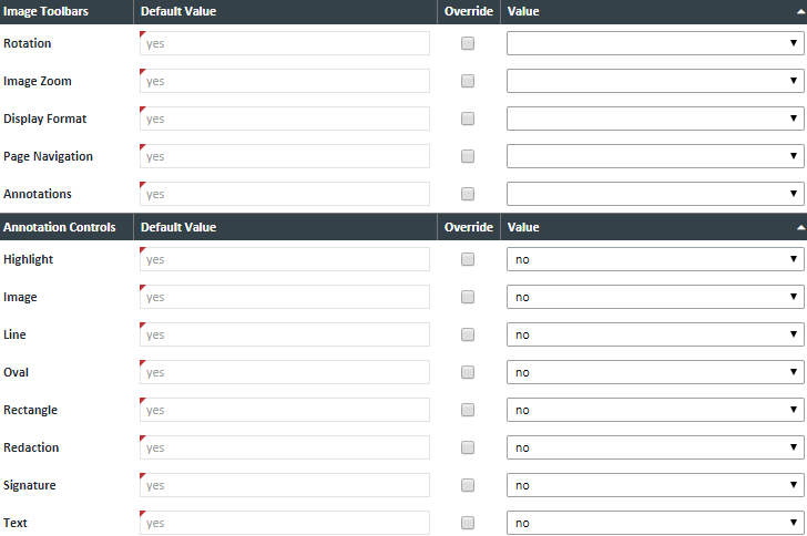 This section focuses on the general User Interface default values for the XDOC Viewer. The default values for this screen are controlled from the same page in the System Tab, but can easily be overridden by checking the override box, entering the new value in the Value box, then clicking SAVE.