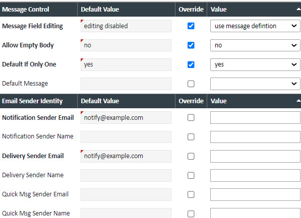 The configuration settings for quick messaging are relatively straightforward. In the screen shot, we have added some examples for override settings. To override any setting, check the "override" box for the field, choose the override value in the "Value" field, the click SAVE