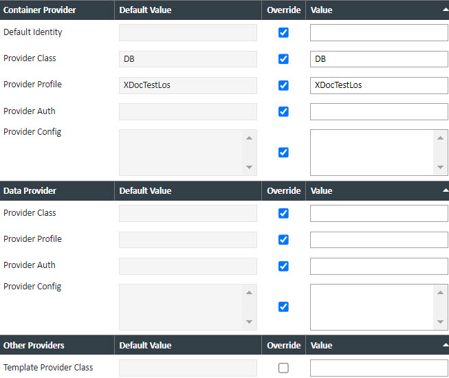 Container Provider, Data Provider and Other Providers – These settings relate to the LOS-specific integrations. These settings are used in conjunction with information from the axSystemConfig.xml file and should not be changed without first consulting XDOC Integration Support.