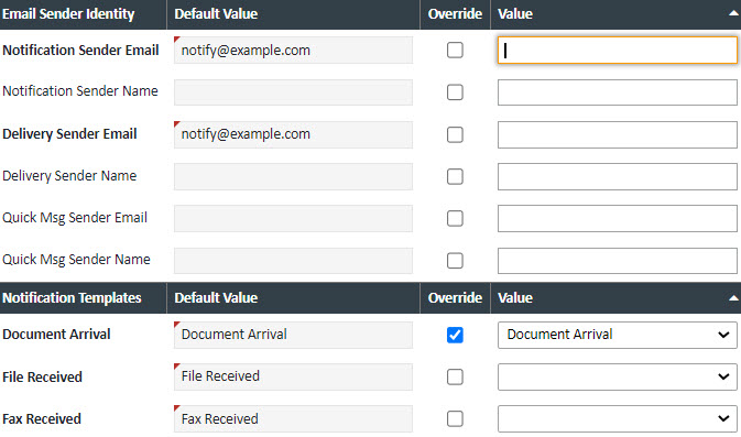 Notification Settings - These settings describe both email defaults when various types of emails get sent from XDOC (from notifications, quick messaging, etc), and the email templates to use.