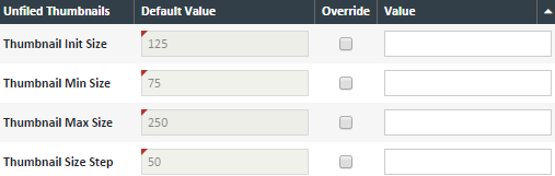 Unfiled Thumbnails – The "Unfiled Thumbnails" tab defines the size values for the thumbnails on this tab.