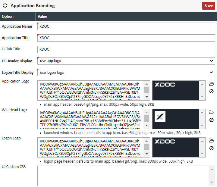 You can re-brand the XDOC website with your own company or product logo in this section. All images must be base64 encoded. You can base64 encode these images in the Utils tab of the XDOC Admin. Utils Tab>String and Encoding>Base-64 Encode