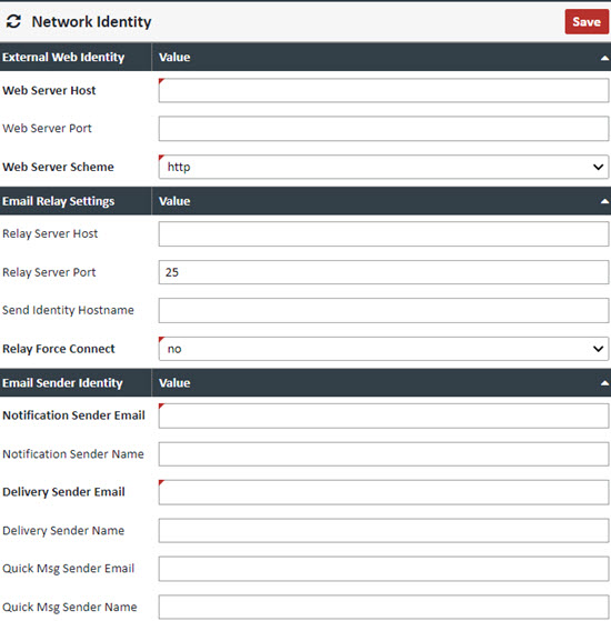 The External Web Identity section sets the parameters that allow you to publish links in email notifications. All links to documents in email notifications will be published using the information in this section of the page.