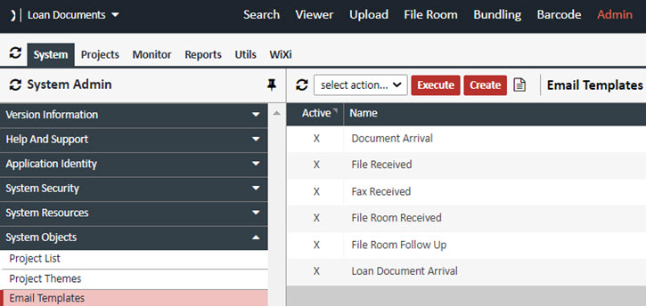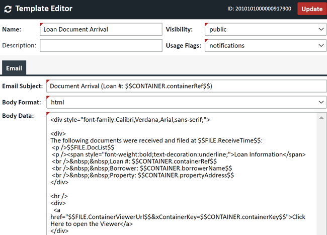 Email Templates allow you to create and modify an outgoing email message when using email notifications. There are several default templates that you can modify, or you can create one yourself. Currently XDOC comes preconfigured to use the Loan Document Arrival template when using email notifications for incoming loan documents. The Email template section can be accessed from System Tab> System Objects>Email Templates