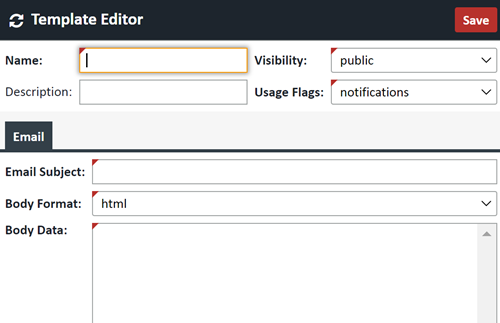 NOTE: Since the Email Templates section has no HTML editor, it is advisable to just copy and paste information from other templates into this new one and modify it to your needs. If you know HTML you can of course design the template yourself