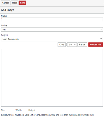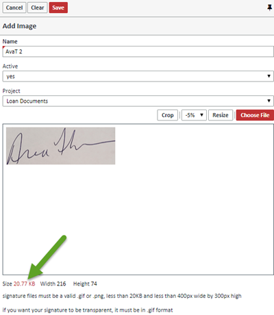 All signature files must be less then 20KB and less than 400 pixels wide by 300 pixels high. You can size the file appropriately. In the screen shot above, the file is too big at 20.77 KB, which is indicated by the field being in red. You can correct this by either clicking the CROP button to crop the file, or choosing an amount to resize the file by and then clicking the RESIZE button. In this case, when you choose the "-5%" option and click resize, the file size is reduced to an acceptable amount and the field is no longer in red.