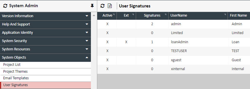 The User Signatures page allows XDOC administrators to upload personal signatures of users to the user's account, adding an extra layer of security for this option. Although signatures can be added by the user from the Viewer screen, this method allows the XDOC Administrator to verify the signatures, delete unneeded and invalid signatures, as well as add any new signatures on the user's behalf.