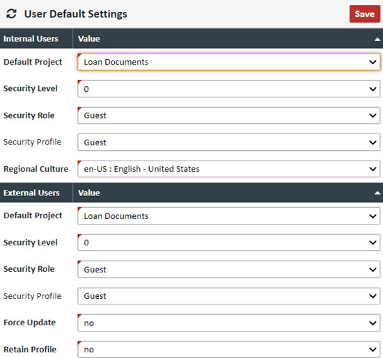- External Users are set up automatically by XDOC's integration with the LOS. These user names and passwords will be the same as in the LOS, as well as managed in the LOS. For the eternal user setup, there are two settings that need more of an explanation: