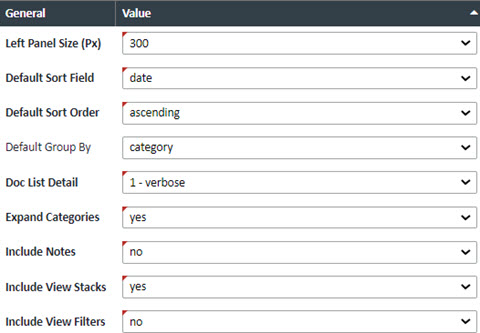 | Doc List Detail | Describes how much information is presented for a document in the document list. Options are from showing the most info (verbose) to the least info (compact). |