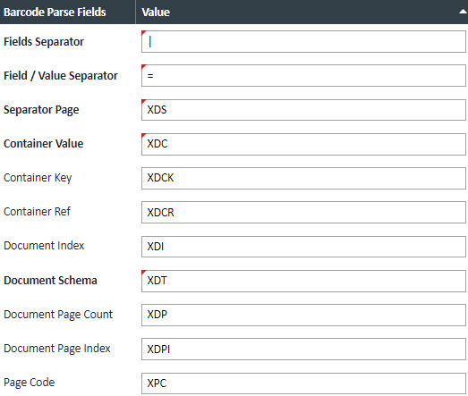 | Barcode Parse Expr | Regular expressions to apply to barcode data for parsing container, document type, and fields. Enter one expression per line following match groups: container, containerKey, containerRef, documentType, docPageCount, and separator. |