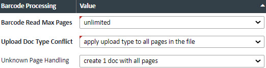 | Upload Doc Type Conflict | Determines what to do with unbarcoded pages for a barcode upload. |