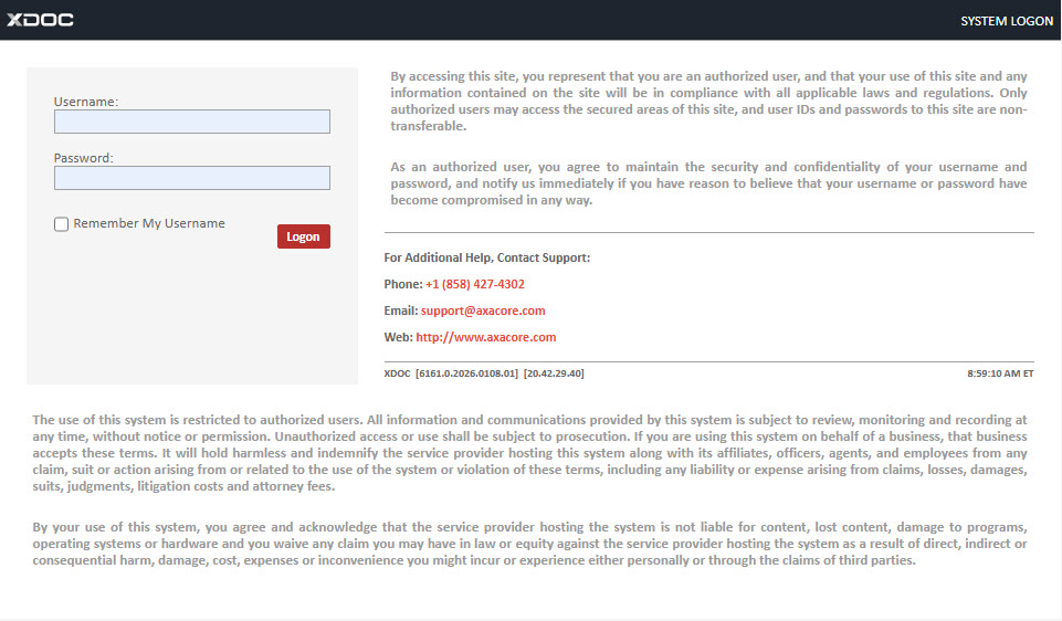 - Enter your username and password on the XDOC login page.